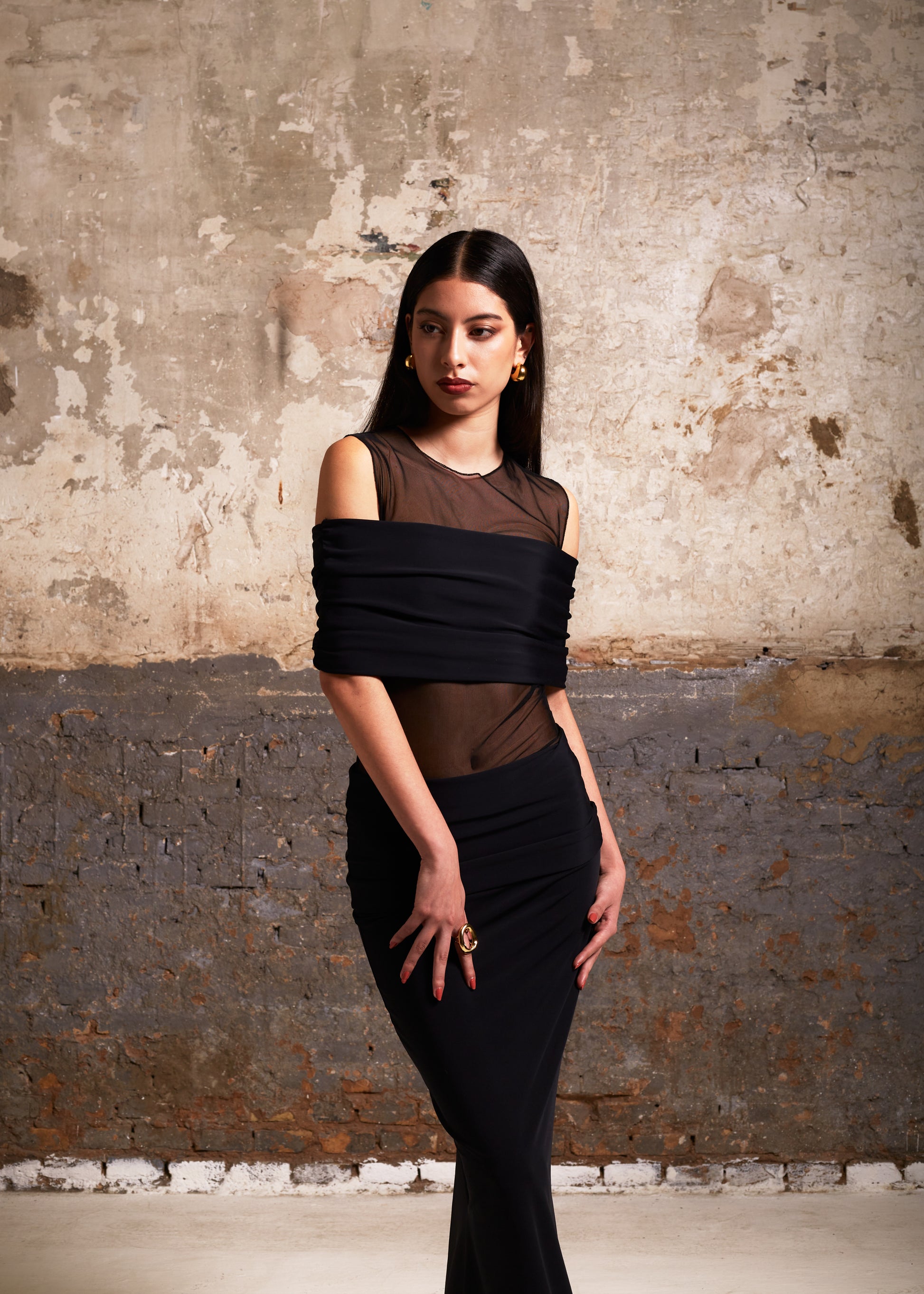Body de dos piezas: base en tul elástico translúcido y banda superior en lycra negra.